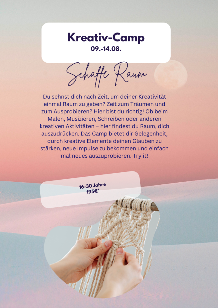- Aktivitäten: buntes Programm mit erlebnisreichen – und pädagogischen, kreative Spielen auf dem Gelände/im Wald, baden im See, der nur 5min zu Fuß entfernt ist, tiefgehende Andachten und Kleingruppen, Kreativzeiten und Workshops zum Ausprobieren, Ausflüge, Lagerfeuer